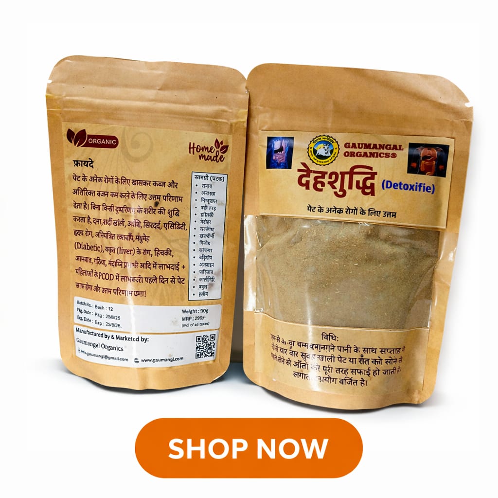 Dehsuddhi Ayurvedic Body Detox Powder by Gaumangal Organics is a unique herbal blend crafted to naturally cleanse and purify your body. Made with ancient Ayurvedic wisdom and authentic Desi Cow–based Panchgavya ingredients, this powder helps eliminate toxins, improve digestion, and rejuvenate your overall health.